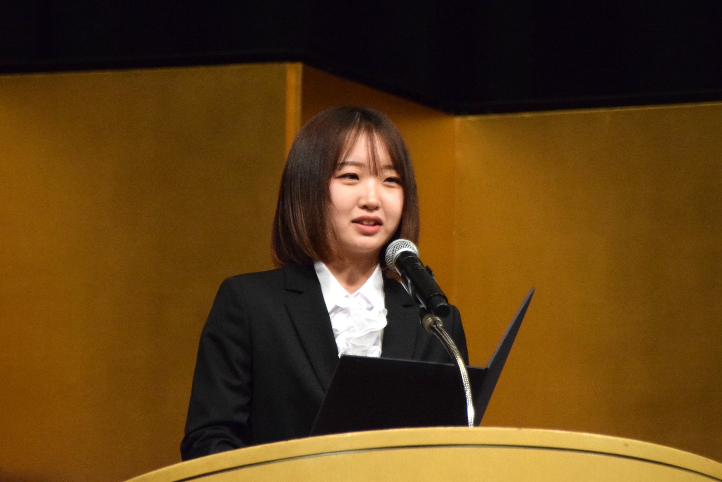 最後に、在校生代表として、2年前にも新入生宣誓をした総合情報メディア学科 ITスペシャリスト専攻 坂口桃花さんが挨拶をしました。自身の経験を踏まえ「どんなことでも自分が頑張れることを伸ばす」ことの大切さを伝え、新入生へ歓迎の言葉を送り、今年度の入学式は閉式しました。