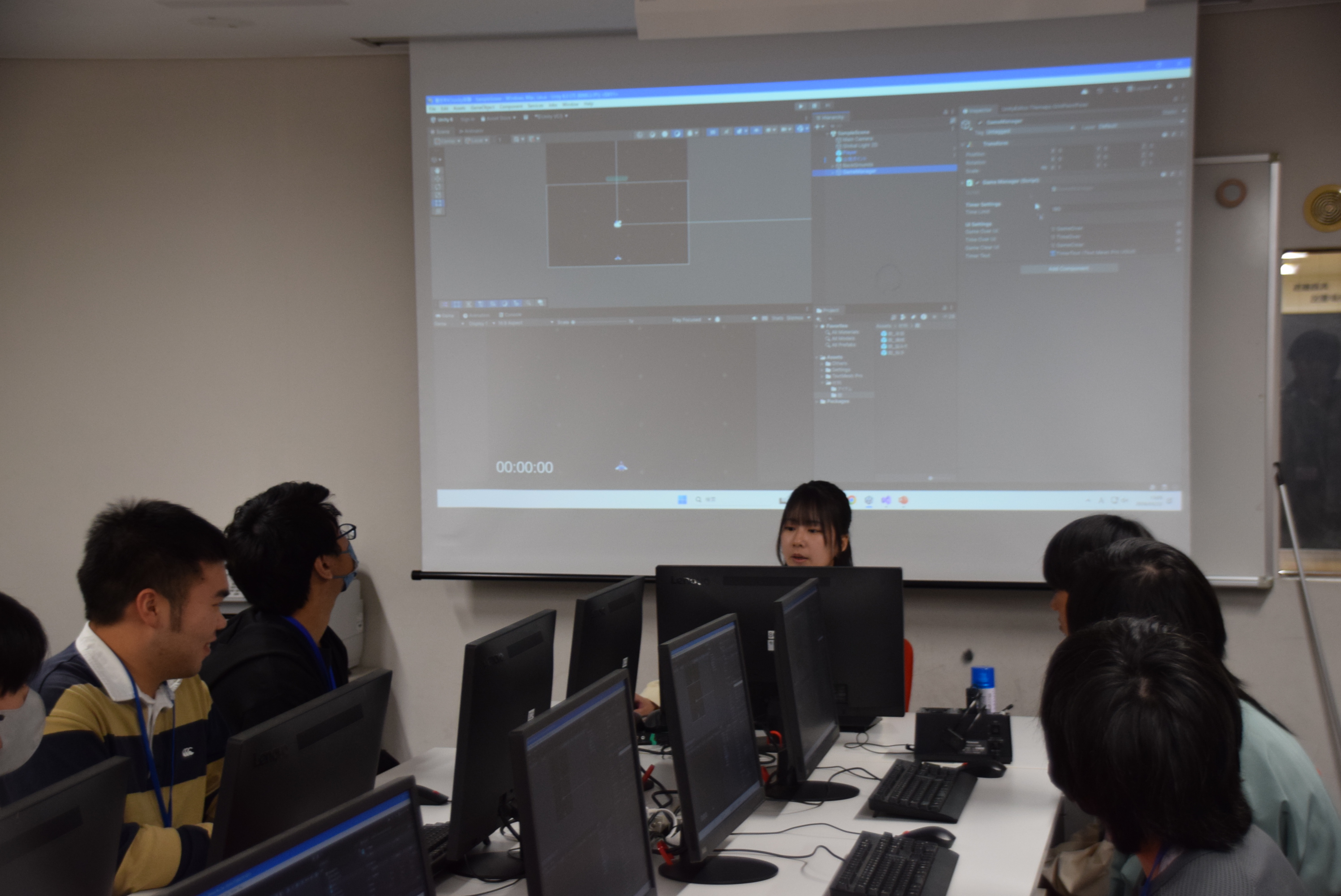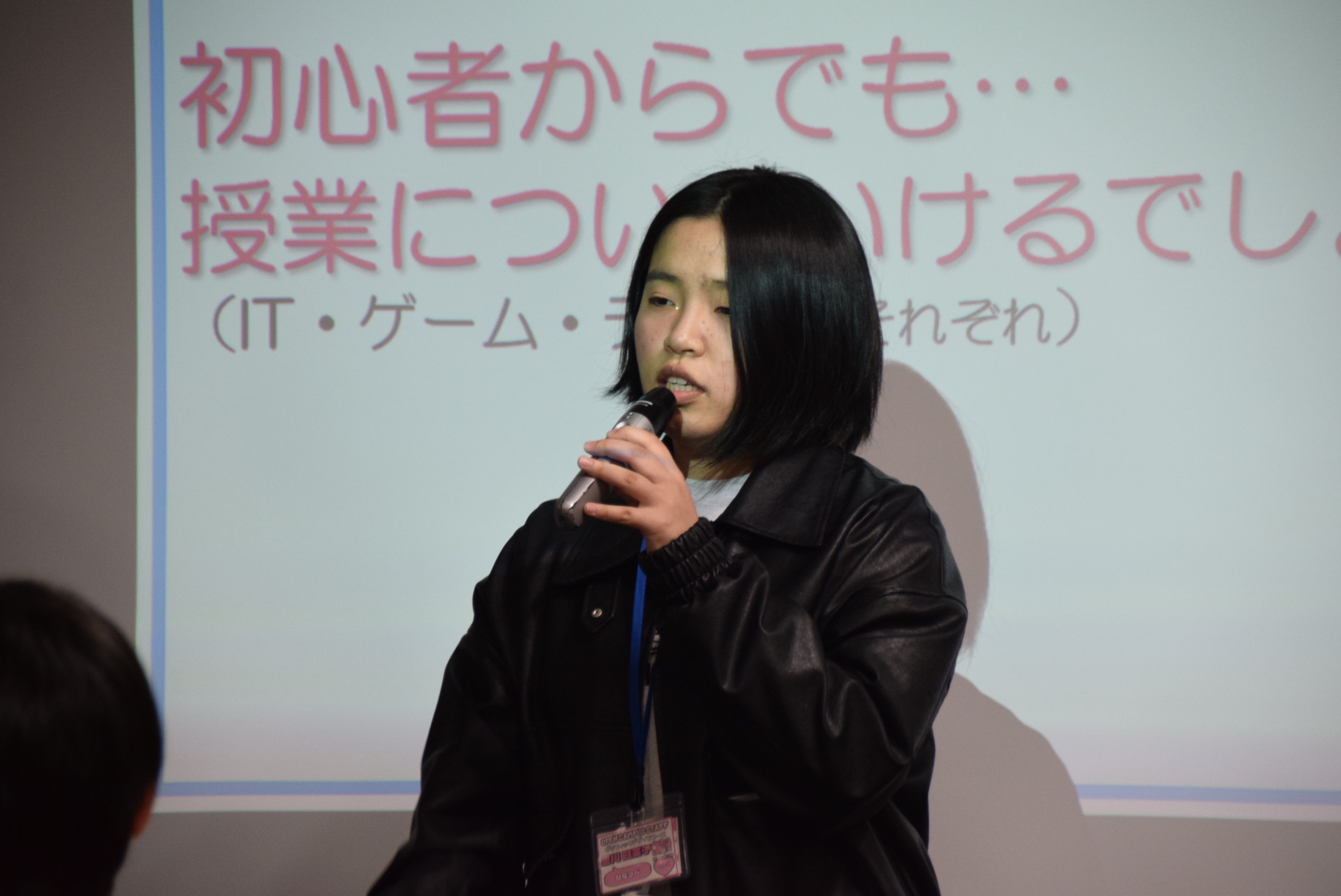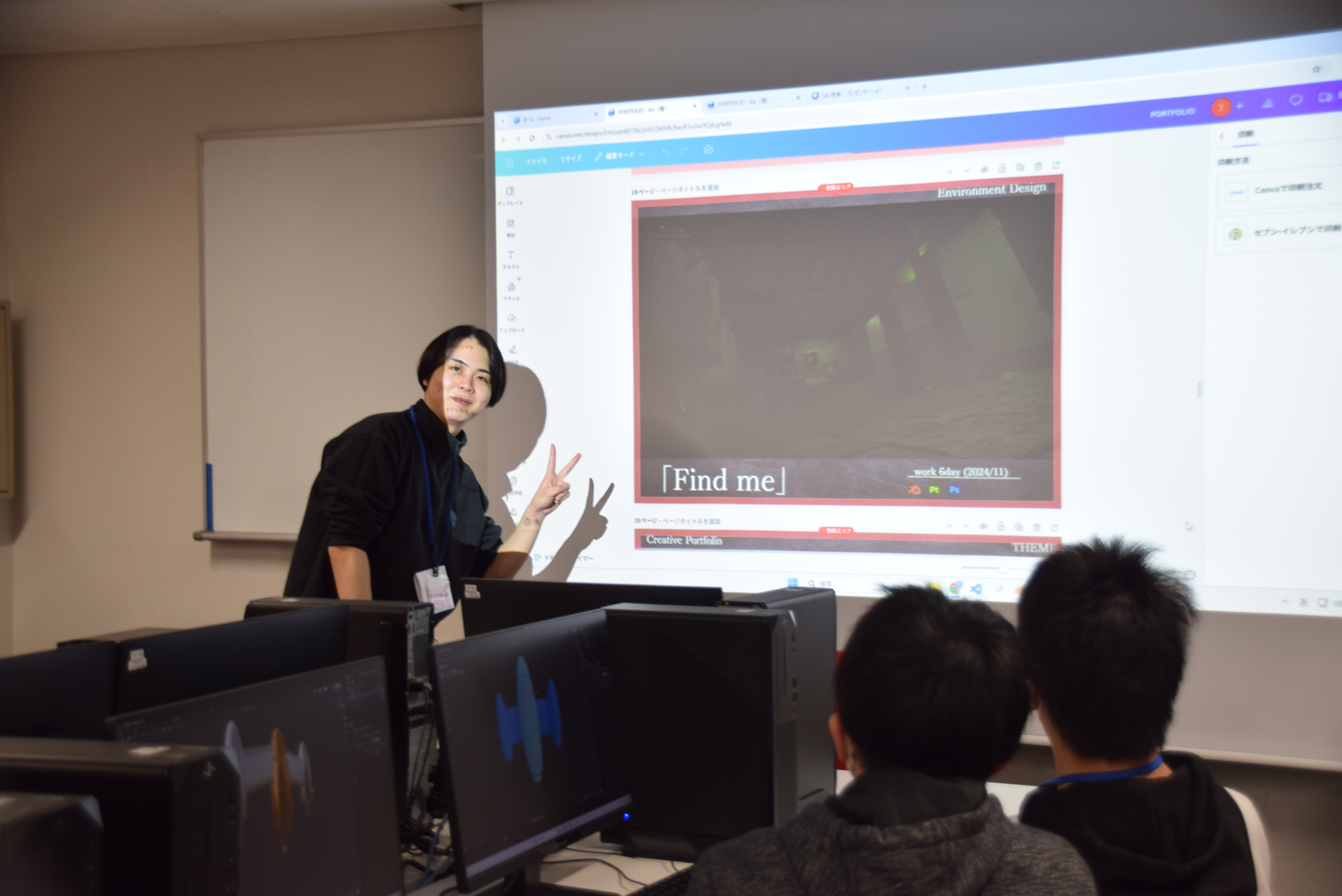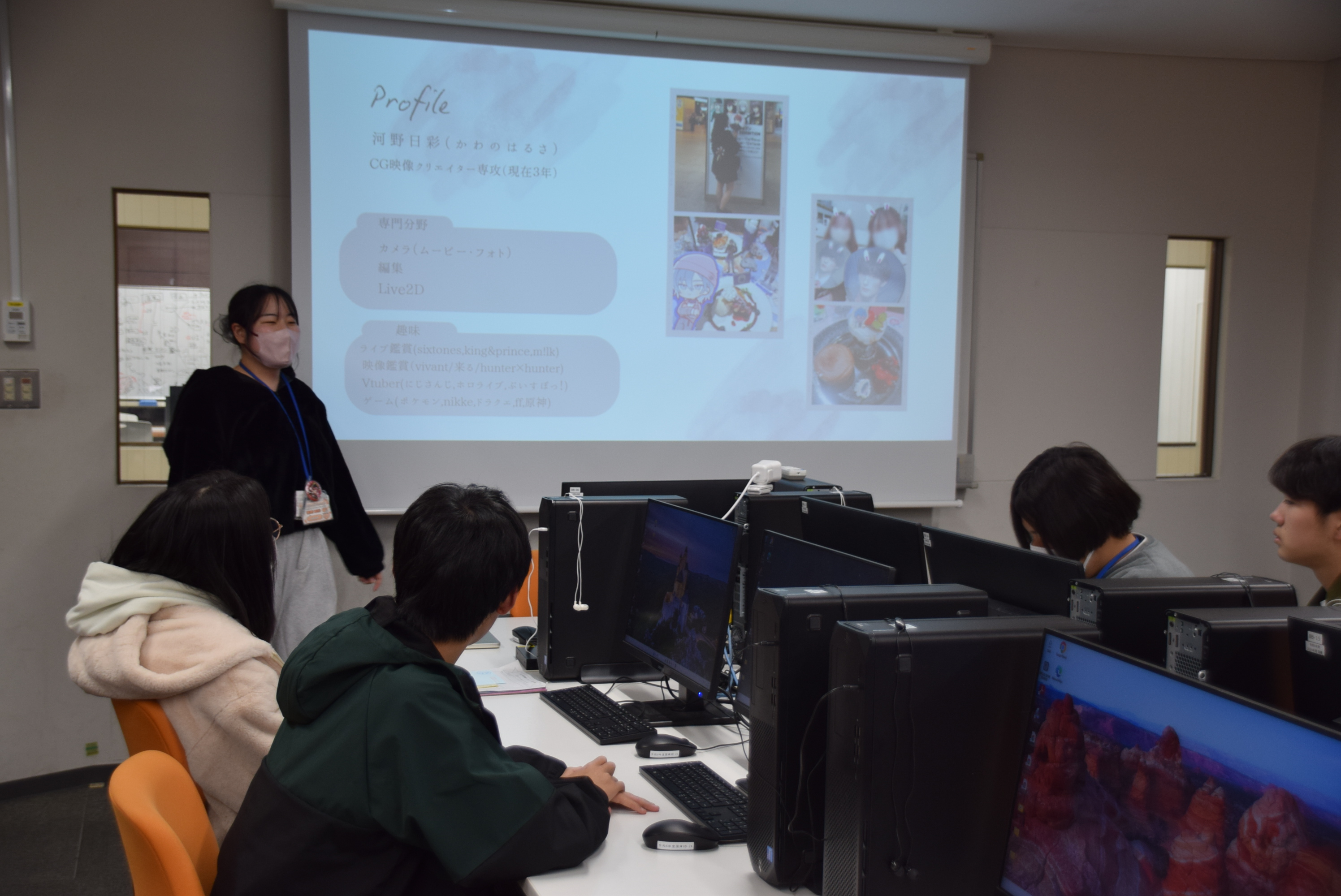 ネットワークセキュリティ専攻の豊福さん(3年)、ゲームプログラマー専攻の亀山さん(3年)、ゲームデザイナー専攻の福田さん(3年)、CG映像クリエイター専攻の河野さん(3年)、アートディレクター専攻の木谷さん(2年)が、各分野のトライアルレッスンの講師を担当しました☺