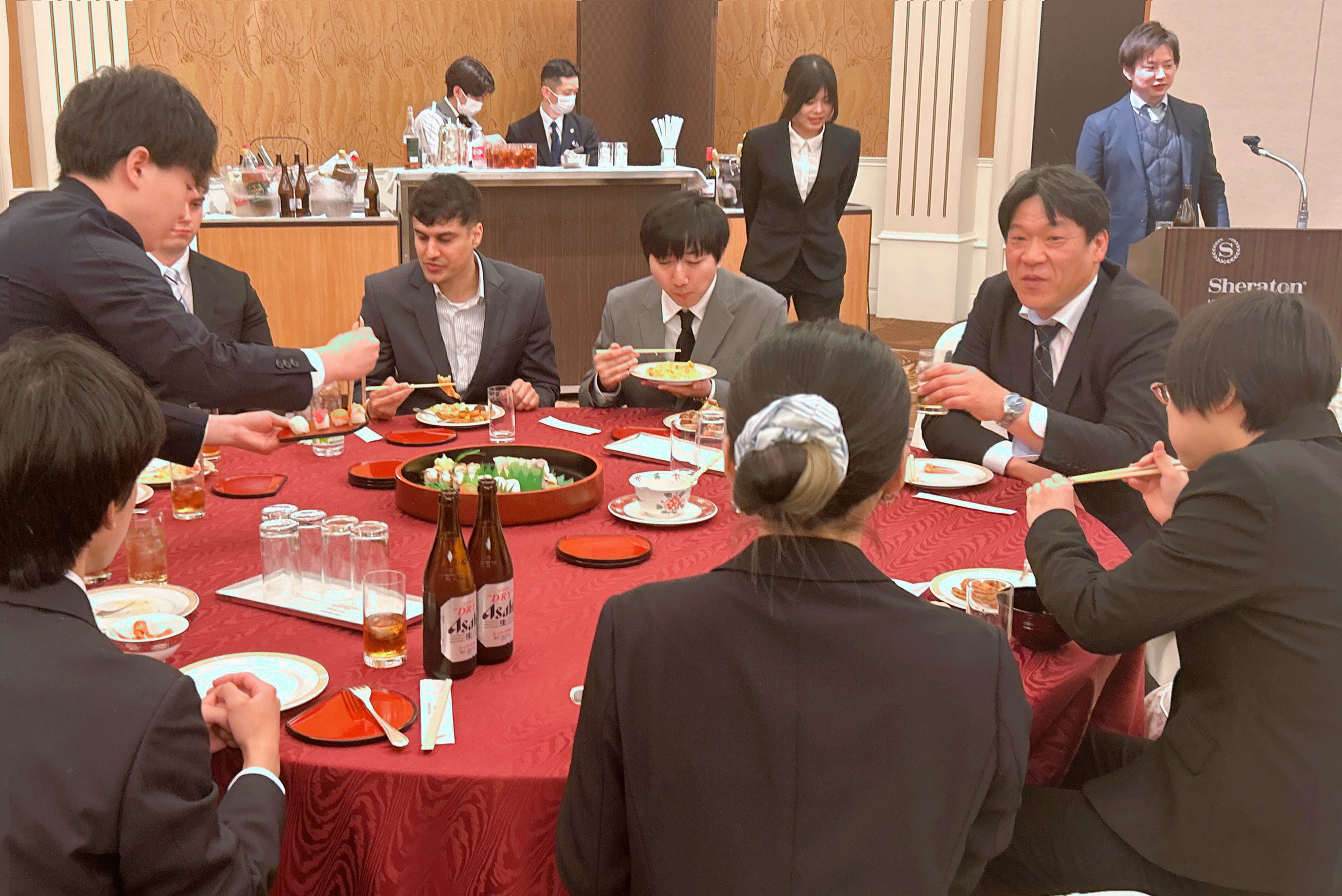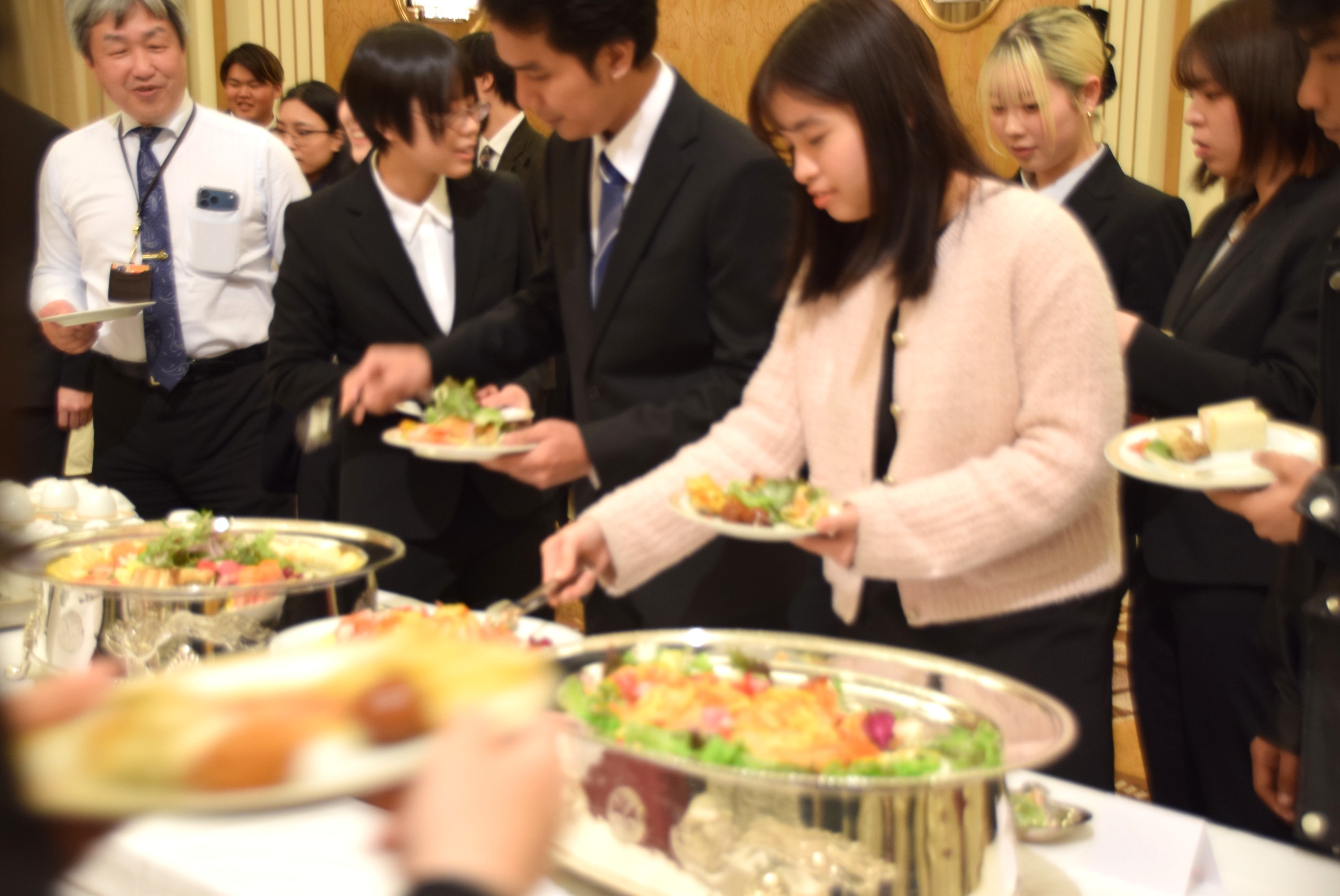 緊張感に満ちた空気から一変し、会場にはホテル自慢の料理が続々と並べられました。呉本校長の乾杯の挨拶が終わると、いよいよお待ちかねの祝賀パーティーの始まりです!おいしい料理を囲みながら学生たちは交流を深めました。