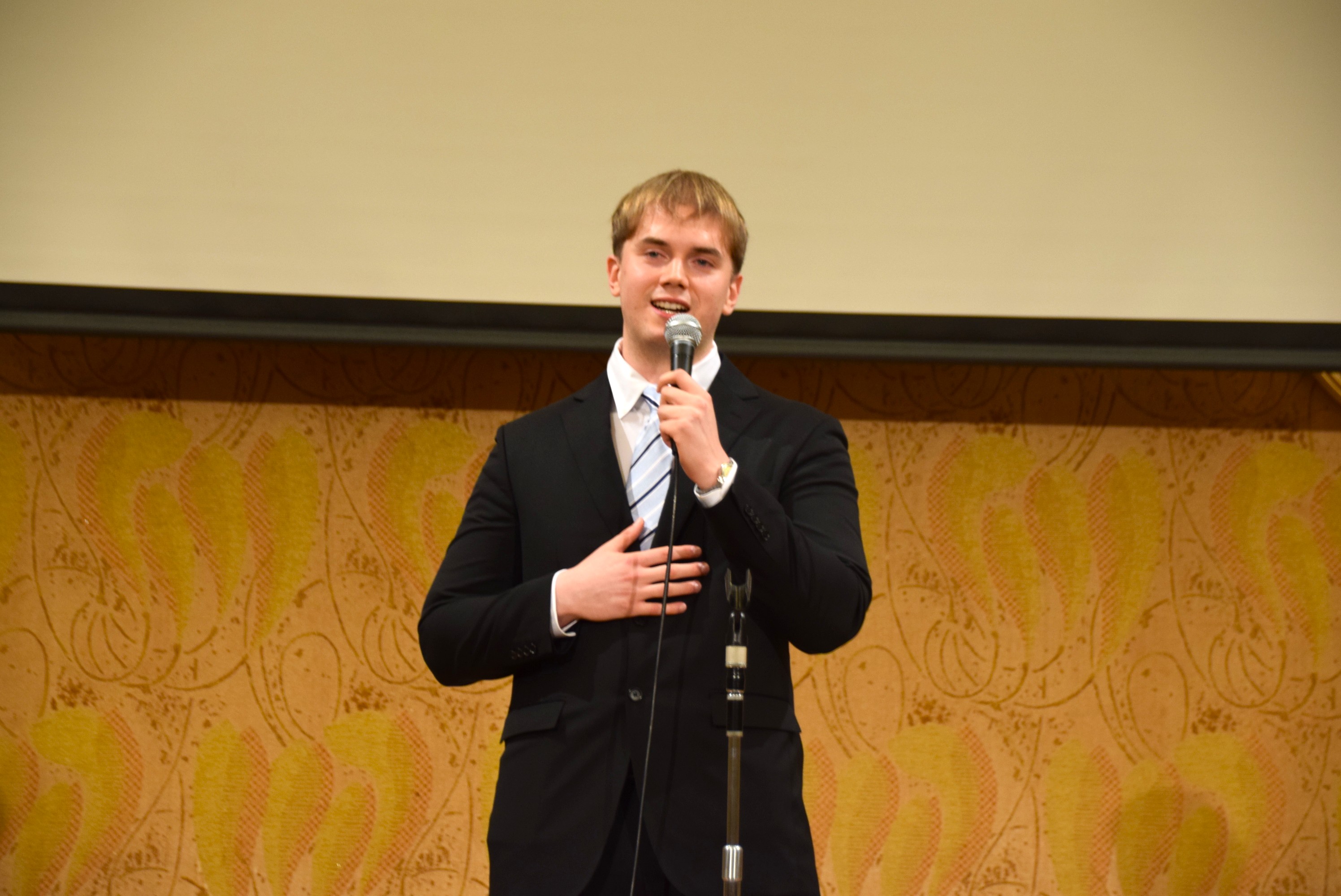 2/5(木)に行われた留学生日本語スピーチコンテストの最優秀者、情報処理学科テクニカルコース2年のクッシターマーティンさんによるスピーチが行われました。マーティンさんは「同調の代償」というテーマで、母国と日本での同調圧力の違いや、自分で考えることの大切さについてスピーチされました。