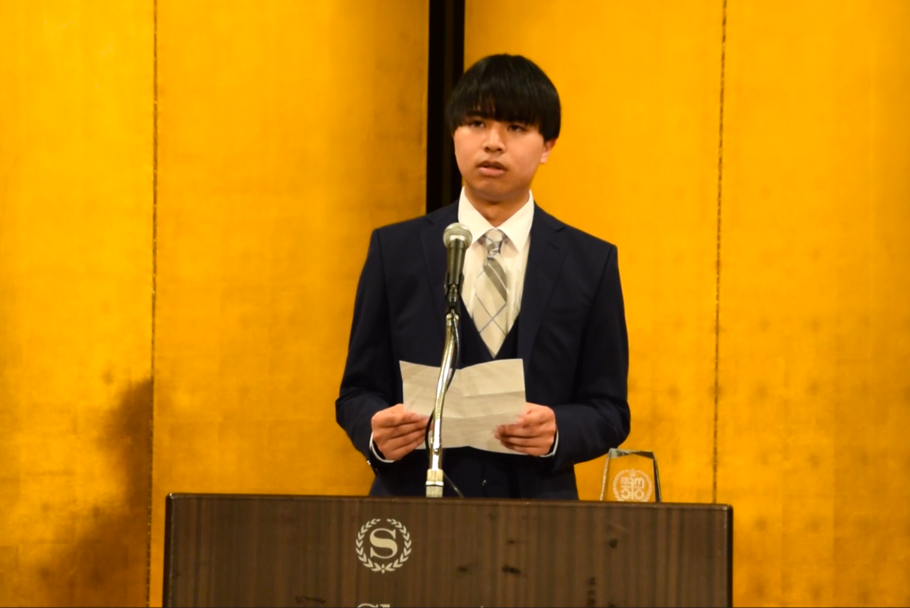 受賞者代表として、総合情報メディア学科ネットワークセキュリティ専攻3年の籔下さんが挨拶をしました。籔下さんは、メディアフロンティア2026 システム部門で最優秀賞、およびメディアフロンティア2026グランプリを受賞した作品「SmartJack」を制作されました。昨年の夏休み前から構想していたこの作品において、グループ制作のむずかしさ・面白さやそこから個人に立ち返るものを、籔下さんはお話しくださいました。今後のさらなる活躍に期待が高まります。
